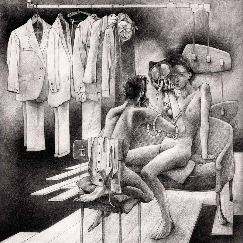The drawing was created using pencils and cigarette ashes on strathmore paper.