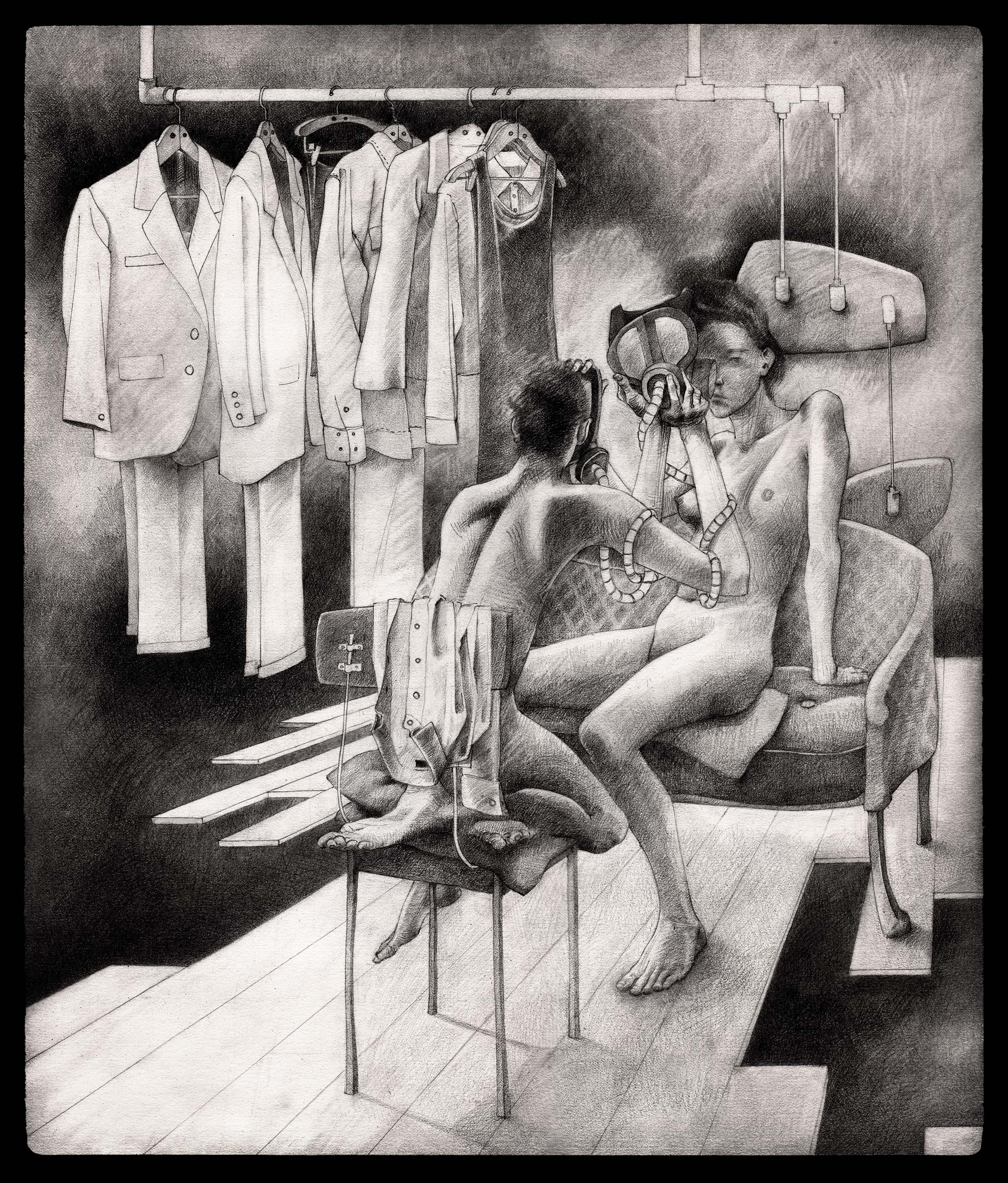 The drawing was created using pencils and cigarette ashes on strathmore paper.