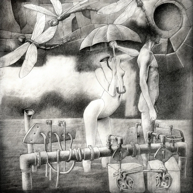 The drawing was created using pencils and cigarette ashes on strathmore paper.